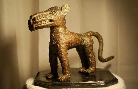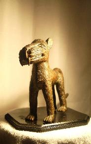 The extraordinary bronzes of the Benin kingdom in what is now Nigeria exhibit a virtuosity and sophistication of style that has astonished the Western world since they were visited in the 15th century. The people of Benin, called Bini, are descended from the Ife, also known for their remarkable bronzes. Almost all Benin art was created to honor the king , or Oba, who has reigned, with his ancestors, from the 15th century. Although similar to many older works, this is a 20th C. piece still sculpted by hand, then cast in bronze by the lost wax process. Bronze Leopards, a royal icon, were often used as royal water vessels. Water was poured from the mouth over the Oba's hands in cleansing rituals. They were kept on royal altars.