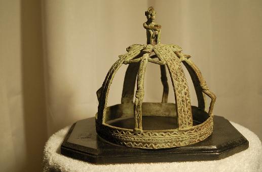 The crown has a central seated figure supported by male and female figures alternating with vertical supports that have zig-zag patterns all of which are typical of Dogon bronze work.