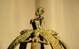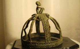 These bronze cast crown express status, prestige and power, and features Dogon 'nommo' on the cast, a very big part of the Dogon society. The crown exhibits the technical skill and artistry that Dogon blacksmiths brought to their work. Made by the complex traditional lost-wax process, the Dogon used metal for their most important ritual objects as well as everyday objects, farming implements and weapons.