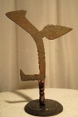 | The throwing knife has developed from a primitive weapon to one of the most beautiful weapons. These "throwing knife" forms were recognized and used sa currency. The great tribal migrations over many centuries and in many directions have all contributed to design changes. The oldest type is found in the Sahel, in North Cameroon. These simple, functional weapons are thrown sidearm, and rotate around their centre of gravity. They usually have two piercing spikes. Some of the knives are still used by African men as both weapons and ornamentation. Knives, axes, currency blades and spears, most made of forged iron, attest to the skills in metal of the blacksmiths of many traditional African peoples. Most exhibit an inventive variety of form and workmanship far beyond what was functionally necessary. Some functioned as weapons. Many , however, were solely for ceremonial or ritual use, or displayed for prestige or status. The largest selections also served as currency, with forms made in the style of weapons, but not functional. All of these are as we obtained them. Many of the currencies, especially, are 19th C. and will exhibit some rust or erosion. Some collectors and dealers prefer the knives highly cleaned, even ground down to the raw metal, then polished. This can be done to any of our knives but it is not a reversible process and we do not do it. |