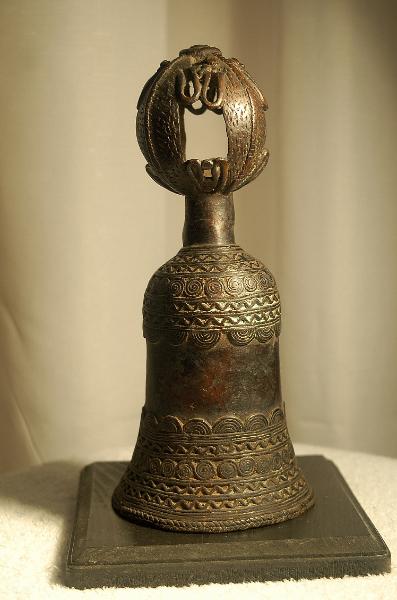 The Bamoun are highly gifted artisans. Their workings are some of the most elaborate, intricate and lavishly detailed pieces in all of Africa. Only the most superior of Bamoun artists are called upon to create Royal Court art; objects whose function is spiritually connected and utilized only by the members of the Royal family. In Bamoun royal court art, images of frogs were displayed as markers of the Kings’ power of fertility. The large spherical hand grip of this solid bronze bell is composed of 8 well detailed interlocked frog motifs. This royal bell is laced with a traditional Bamoun royal design pattern. The bell is very well crafted, heavy in weight and is completely functional.