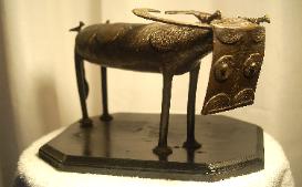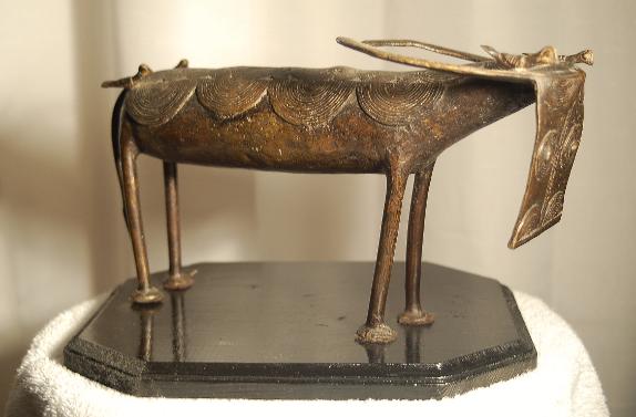 This bronze Bedu is used to teach the young boys of the bush school about the cycles of life. When animals are seen grazing, it means the crops have been bountiful. The Bedu is a mythological animal that combines the traits of the bush cow and antelope. The birds on the horns and tail symbolize the interdependence between different forms of life in the bush including man.