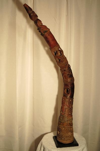 Edo Horn 20th c. This wonderfully carved and well-used side blown trumpet comes from an unidentified ruler’s court among the Edo people. The Edo of Nigeria once were known as the great kingdom of Benin and this trumpet truly reflects the great carvers of that period. It has a wonderful patination from long use and the quality of carving and detailing of the figures and design is to be admired. Perhaps based upon earlier ivory carving this sculpted trumpet is a classic example of traditions continued. The kneeling female figure surmounting the trumpet served as the handle. Just below an undecorated section and above the mouthpiece two partial figures are shown carved in relief. Immediately below a pattern in relief shows a quatre-foil leaf pattern seen much earlier in the art of ancient Benin on carvings and the famous bronze plaques dating as early as the 16th century. The undecorated band is where the player held the trumpet and just below it the end of the trumpet is decorated with a set of quatre-foil motifs. The trumpet is a prime example of early twentieth century sculpture from an area renowned for its culture and carvings and would hold a prominent place in a collection