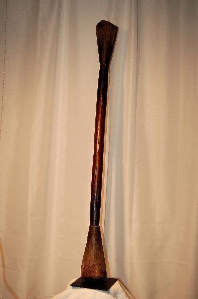 The grinding and pounding of grains using large mortars and pestles is endemic to West Africa and, for that matter, much of the world. The carefully carved and elegantly worn pestle that is presented here could be from a number of cultures. It is unusual in that it is double-headed. Most everyday objects used in Africa for the preparation of food, particularly pestles, are quite simple. Although simplicity applies to this piece as well, it was obviously carved with care, so the ceremonial use of this pestle cannot be ruled out.