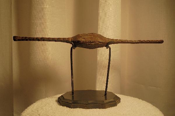 These miscellaneously named "losol," "sasoreng," "tajere," or "saka." Made by Batta and Mumuye peoples, who were subject to the Fulani, northeastern. Iron currency rods were widely used throughout the different Nigerian districts, the shape being one of the few ways to distinguish origin since trade was so widespread. The distinctive shape of the flat, expanded middle and slightly twisted ends clearly indicate this as a piece of the Mumuye tribe where they were carefully forged. The Fulani called these pieces "losol" in the east and "tajere" or "taji" (plural) in the west, as did the Batta and Mumuye to the south; today most people simply refer to these old pieces as "Mumuye" currency. These rods were ultimately used for making hoes or other implements, but they were widely used for currency by both the non-Moslem tribes and in the Muslim markets where the pagan tribes traded.